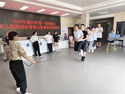 近日,2025年衢州市第一届残疾人盲人跳绳锦标赛常山队赛前训练活动在县残疾人托养中心举行,12名视障人士参加。体育教练为他们量身定制了科学系统的训练方案,通过声音引导、肢体辅助等方式帮助大家掌握跳绳技巧,进一步提高他们的身体素质和体育竞技水平。